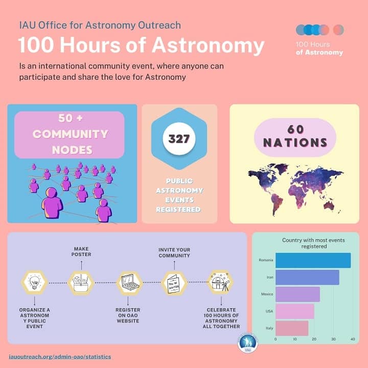 از ۲ تا ۵ اکتبر ۲۰۲۵، «۱۰۰ ساعت نجوم» را جشن گرفتیم و به لطف اشتیاق جامعه‌مان، فعالیت‌ها در تمام ماه ادامه یافت. امسال بیشترین میزان مشارکت از سوی NOCها را داشتیم؛ به‌طوری‌که چندین کشور آن‌قدر جدی در این رویداد حضور پیدا کردند که هرکدام بیش از ۳۰ فعالیت برگزار کردند.