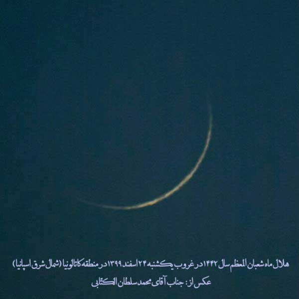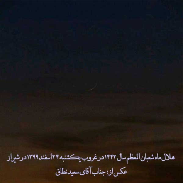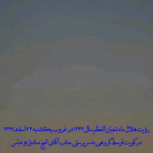 احتراماً ضمن عرض تبریک و تهنیت به مناسبت أعیاد شعبانیه، گزارش استهلال و رویت هلال شعبان المعظم 1442 را به استحضار میرساند: در بعد از ظهر روز شنبه 23/12/1399 مطابق با 29/7/1442 (براساس تقویم رسمی کشور)، هوای شهر مقدّس قم وضعیّت نیمه ابری داشت. رصدگران هم با تجهیزات لازم در محلهای تعیین شده، حاضر گردیده و به انجام استهلال همت گماشتند، لکن در نهایت هیچکدام از تلاشگران در این عرصه، موفّق به رویت هلال شعبان 1442 نشدند. و البته در این میان، هیچ گزارشی هم دالّ بر رویت هلال از هیچ منطقهای از کشور و مناطق اطراف به دست نیامد.