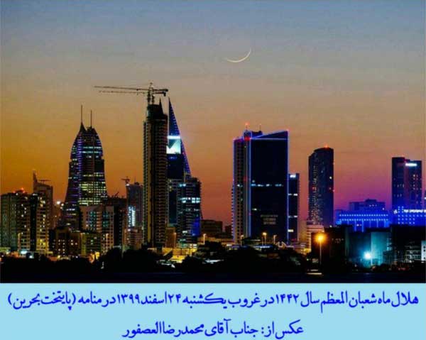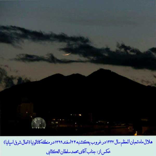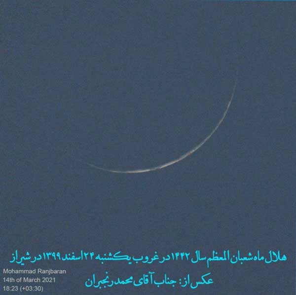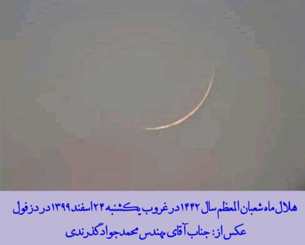 شایان ذکر است: هـلال ماه شعبان المعظّـم 1442 در غروب روز یکشنبه بیست و چـهارم اسفندماه 1399 ، در شهرهای «دزفول» (استان خوزستان) ، «شیراز» (استان فارس) توسط چند گروه از جمله: جمعی از طلاب مدرسة تخصّصی فقه امام رضا (صلوات الله و سلامه علیه) ، «کویت» ، «منامه» (پایتخت بحرین) و «منطقة خودمختار کاتالونیا» در شمال شرق اسپانیا با چشم مسلّح و غیر مسلّح (عادی) رؤیت گردید.
