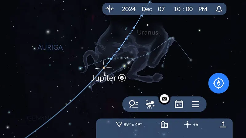 برای بررسی سریع اینکه آیا امشب مشتری قابل مشاهده است، روی نماد تلسکوپ در پایین صفحه اپ ضربه بزنید و ببینید آیا مشتری در لیست ظاهر میشود یا خیر.